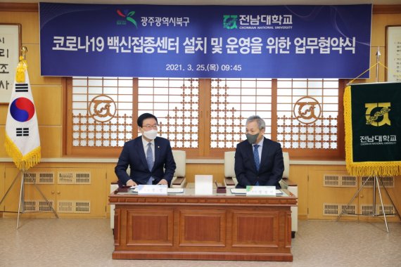 전남대는 25일 오전 대학본부 5층 접견실에서 광주 북구와 코로나19 백신접종센터 설치와 운영을 위한 업무협약을 체결하고, 전남대 스포츠센터와 보조운동장을 북구 백신접종 공간으로 제공하기로 했다.