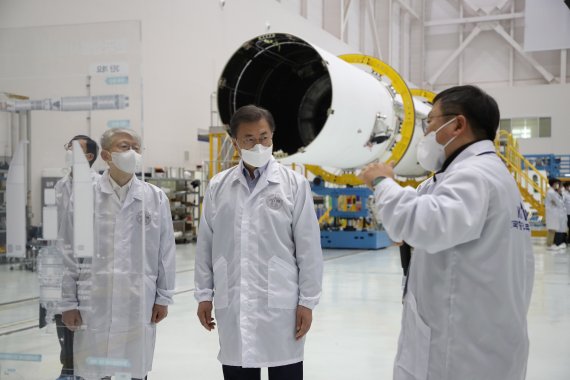 문 대통령은 또 "우리는 위성 분야에서는 세계 7위 정도의 수준을 가지고 있다. 이제 발사체의 자립에 있어서도 세계 7위의 수준을 갖추게 되었다"며 "'세계 7대 우주 강국', 아직은 낯설게 느껴지는 우리의 꿈이 이렇게 쑥쑥 자라나고 있다"고 강조했다.