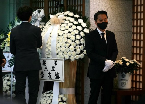 (서울=뉴스1) 황덕현 기자,이비슬 기자 = 28일 농심 창업주 율촌(栗村) 신춘호 회장의 빈소에 구속 상태인 이재용 삼성전자 부회장의 조화가 들어서 눈길을 끌고 있다.