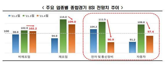 특히 국내 주력 산업인 전자·통신장비(90.9, -20.6포인트)와 자동차(97.4, -11.4포인트)의 경우 전망치가 전월 대비 큰 폭으로 감소(각 -20.6포인트, -11.4포인트)하며 오히려 부정적 전망이 우세했다.