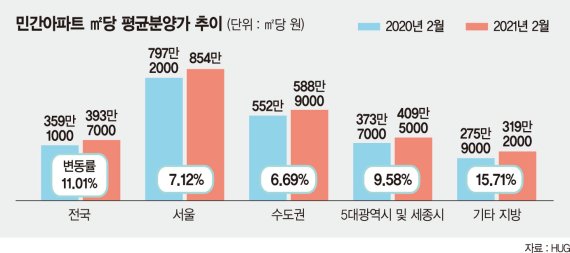 지역별로보면 2월 기준 ㎡당 평균 분양가는 서울 854만원, 수도권 588만9000원, 5대광역시 및 세종시 409만5000원, 기타지방 319만2000원으로 전년동기대비 각각 7.12%, 6.69%, 9.58%, 15.71% 올랐다.