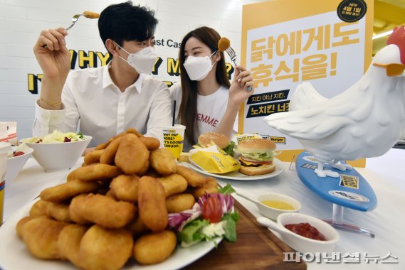 노브랜드버거가 31일 오전 서울 무교로 서울시청점에서 닭고기 대체육으로 만든 노치킨 너겟을 선보였다.