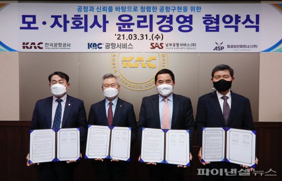 [파이낸셜뉴스] 한국공항공사는 31일 서울시 강서구 본사에서 KAC공항서비스, 남부공항서비스, 항공보안파트너스 등 3개 자회사와 청렴·신뢰공항 구현을 위한 '모·자회사 윤리경영 협약'을 체결했다고 밝혔다.