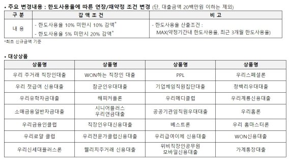 대상 상품은 Δ우리 주거래 직장인대출 Δ우리 첫급여 신용대출 ΔWON하는 직장인 대출 Δ직장인우대신용대출 Δ우리급여이체 신용대출 Δ위비직장인공무원 모바일신용대출 Δ우리스페셜론 등 총 28개다.