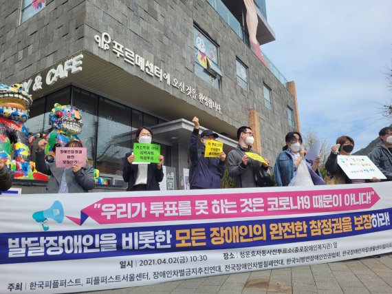전국장애인차별철폐연대 등 장애인 시민단체들은 이날 서울 종로구 종로장애인복지관 앞에서 기자회견을 열고 "모든 장애인의 완전한 참정권을 보장해야 한다"고 촉구했다.