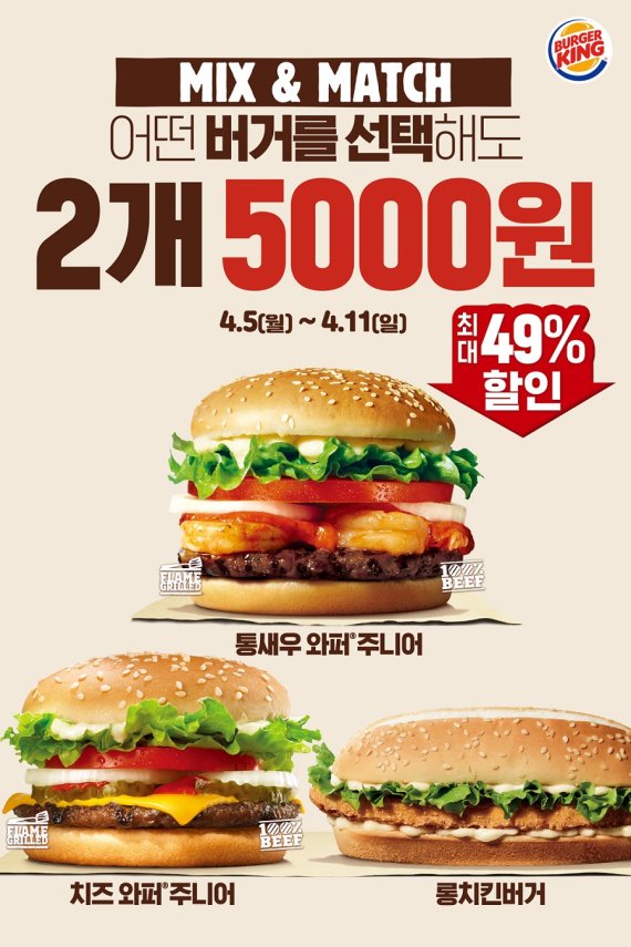 [파이낸셜뉴스] 햄버거 브랜드 버거킹이 오는 11일까지 스테디셀러 버거 2종을 5000원에 구매할 수 있는 '믹스앤매치(Mix & Match)' 프로모션을 실시한다고 5일 밝혔다.