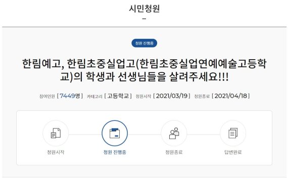 한림예고 교직원이라고 스스로를 소개한 청원인은 지난달 19일 교육청 시민청원 게시판에 '한림예고·한림초중실업고(한림초중실업연예예술고등학교)의 학생과 선생님들을 살려주세요'라는 글을 올렸다.
