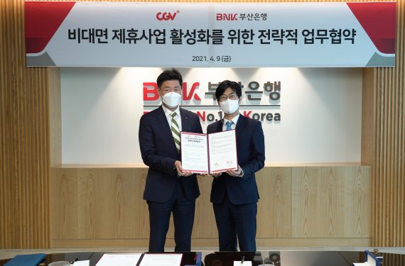 BNK부산은행은 9일 문현동 본점에서 CJ CGV와 ‘비대면 제휴사업’ 활성화를 위한 전략적 업무협약을 체결했다.