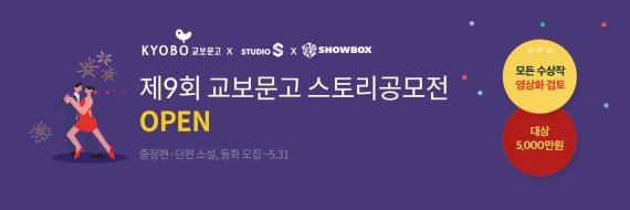 [파이낸셜뉴스] 교보문고는 ‘스튜디오 S’, ‘쇼박스'가 공동주최하고 고래가숨쉬는도서관, 투유드림, 한국창작스토리작가협회, 홍당무가 후원하는 '제9회 교보문고 스토리공모전'을 개최한다고 12일 밝혔다.
