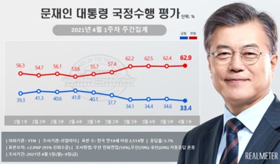 여론조사 전문기관 리얼미터가 YTN 의뢰로 지난 5~9일 만 18세 이상 2514명을 대상으로 실시한 여론조사 결과 결과, 문재인 대통령의 국정수행에 대한 긍정평가는 33.4%로, 전주 대비 1.2%포인트 하락했다. 이는 종전 최저치인 3월 3주차 34.1%보다 1.2%포인트 내린 수치다.