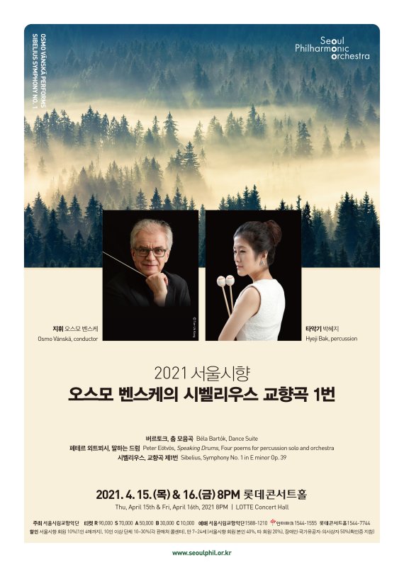 서울시향은 이번 공연에서 시벨리우스 교향곡 1번 외에도 버르토크 '춤 모음곡'과 외트뵈시의 '말하는 드럼'을 선보인다. 헝가리 출신의 작곡가 버르토크의 '춤 모음곡'은 헝가리와 터키, 아라비아와 루마니아에서 온 여러 멜로디를 바탕으로 오스만 제국의 다양한 음악 전통을 펼쳐내는 곡이며, 퍼커셔니스트 박혜지와 함께 선보이는 페테르 외트뵈시의 '말하는 드럼'은 춤곡으로 시작해 '난센스 송(Nonsense Songs)'을 거쳐 '파사칼리아'로 이어지는 모음곡으로 북과 카우벨, 공, 탐탐, 우드블록, 심벌즈, 팀파니, 종, 마림바 등 클래식 타악기의 다양한 음색을 감상할 수 있다.
