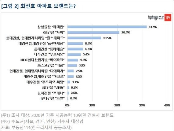 한편 부동산114와 한국리서치가 공동으로 조사한 '아파트 브랜드 주거 만족도' 설문조사의 오차 범위는 95% 신뢰수준에 ±2.0%p다.