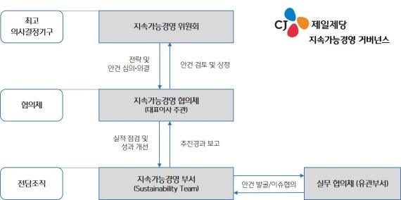 CJ제일제당은 ESG 경영 강화를 위해 이사회 내에 '지속가능경영 위원회'를 신설했다. 지속가능경영 최고 의사결정기구다. 최은석 대표이사와 사외이사 4인 등 총 5인으로 구성됐다.