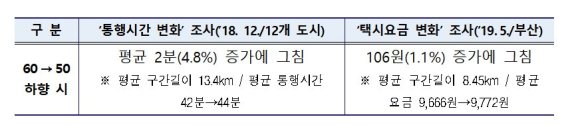 정부는 "일부에서 교통정체를 우려하는 목소리도 있었지만, 서울·부산 등 대도시에서의 주행실험 결과 통행시간에는 거의 변화가 없는 것으로 나타났다"고 설명했다.