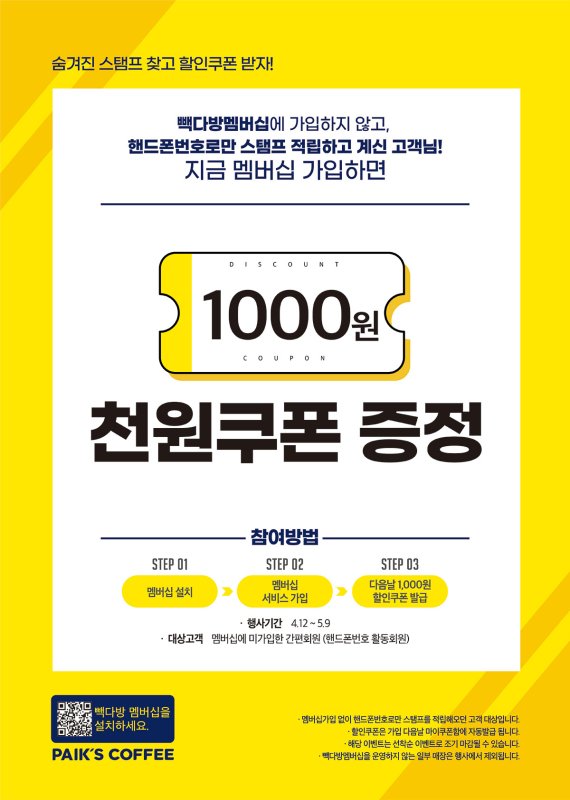 5월 9일까지 진행되는 이번 프로모션은 빽다방 멤버십 앱을 설치하고 가입을 하면 다음날 1000원 할인 쿠폰이 자동 발급된다. 매장에서 계산 시 발급 받은 쿠폰을 제시하거나, 모바일 주문 결제 서비스인 '스마트오더'로 주문 및 결제 시에 쿠폰을 적용하면 할인 혜택을 받을 수 있다.