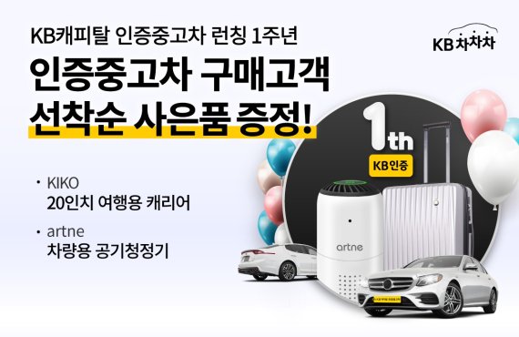 선착순으로 진행되는 이번 이벤트는 KB캐피탈 인증중고차 구매 시 고객의 선택에 따라 차량용 고급 공기청정기와 여행용 캐리어를 증정한다.