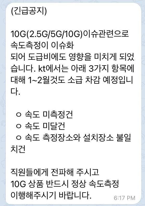 노조 측에 따르면 KT 계열사인 KTS(KT서비스)는 직원들에게 문자를 통해 “10G(2.5G/5G/10G) 이슈 관련으로 속도 측정이 이슈화돼 도급비에도 영향을 미치게 됐다. KT에서는 △속도 미측정건 △속도 미달건 △속도 측정장소와 설치장소 불일치건 3가지 항목에 대해 1~2월 것도 소급 차감 예정”이라며 “직원들에게 전파해 주시고 10G 상품 반드시 정상 속도측정 이행해주시기 바란다”고 공지했다.