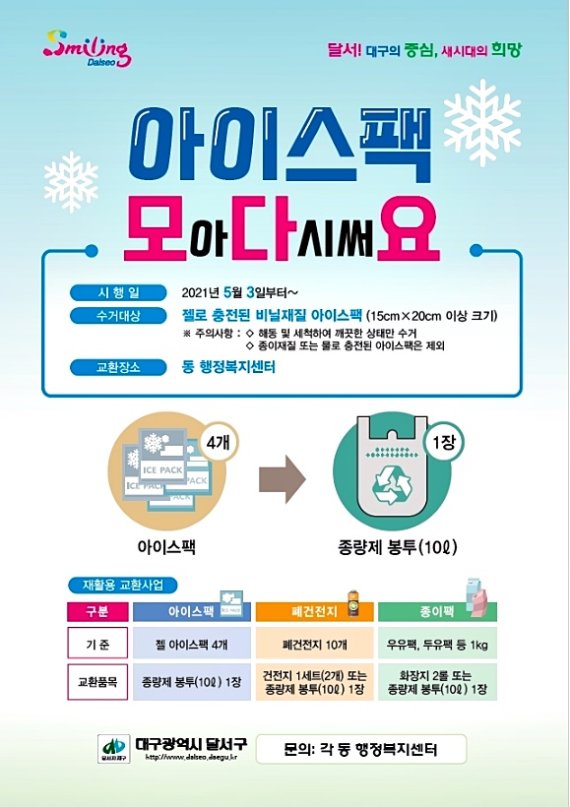 달서구는 아이스팩 수집과 운반·세척·수요처 발굴 등 전 과정을 총괄 관리를 맡는다. 한국환경공단 대구경북환경본부는 아이스팩 보관 장소와 수거함을 제공한다.