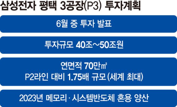 22일 파이낸셜뉴스 취재 결과 삼성전자와 평택시는 P3 투자 발표시기를 6월로 정하고 현재 막바지 조율작업 중인 것으로 확인됐다. 삼성전자와 협업 중인 평택시 관계자는 "삼성에서 평택 P3 투자를 6월에 발표할 예정"이라며 "정확한 날짜는 아직 정해지지 않았으나 6월 발표를 전제로 작업이 진행되고 있다"고 밝혔다. 이어 "총 투자규모는 40조~50조원 선이 될 것"이라며 "구체적으로는 외관 완공 후 시스템반도체 비중을 얼마나 둘 것이냐에 따라 투자규모가 달라질 것"이라고 설명했다.