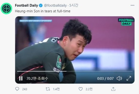 '스포츠바이블'도 붉게 충혈된 눈으로 눈물을 흘린 손흥민을 바라보며 "평소 쾌활하던 손흥민은 경기 종료 휘슬이 불린 뒤에도 울음을 멈출 수 없었다"며 "그는 데 브라위너에게 위로를 받았다. 손흥민은 분명 결과를 마음에 새겼을 것"이라고 했다.