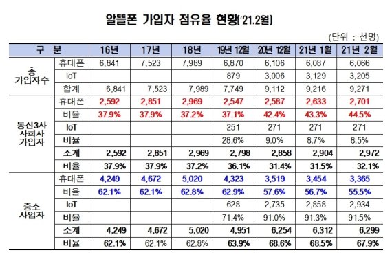 26일 국회 과학기술정보방송통신위윈회 무소속 양정숙 의원이 과학기술정보통신부로부터 제출받은 자료에 따르면, 지난 2월 현재 알뜰폰 회선 가입자 927만명 가운데 사물인터넷(IoT) 등 회선을 제외한 순수 휴대폰 회선 가입자는 606만명이다. 이중 통신 3사 자회사의 가입자가 270만명으로 44.5%에 달하는 것으로 집계됐다.