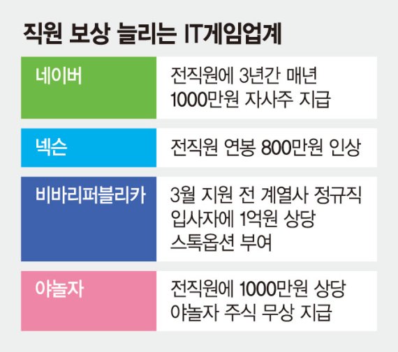 게임업계도 연봉 인상 경쟁도 뜨겁다. 넥슨이 전 직원 연봉을 800만원 인사을 발표했고, 넷마블도 일괄 인상에 동참했다. 연내 상장을 목표로 하고 있는 넷마블의 자회사인 '넷마블네오'도 임직원에게 약 67여만주를 지급한 것으로 전해졌다.