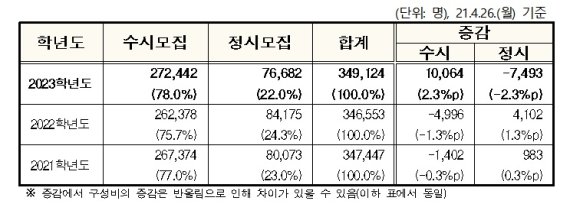 2023학년도 대입 전체 모집인원은 34만9124명으로 22.0%인 7만6682명을 정시에서 선발한다. 수시에서는 78.0%인 27만2442명을 뽑는다. 수시에서 전년 대비 1만64명 늘어난 반면 정시에서 7493명이 줄었다.