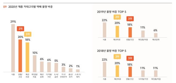 2019년 물량 비중 2위는 '패션·의류'(20%)였으나, 지난해에는 '생활·건강' 품목에 2위 자리를 내줬다. 코로나 사태로 건강과 위생에 대한 관심이 커지고 집에 머무는 시간이 늘면서 위생용품, 청소용품, 건강용품 등을 아우르는 '생활·건강' 제품군 물량이 전년 대비 50% 증가했다.