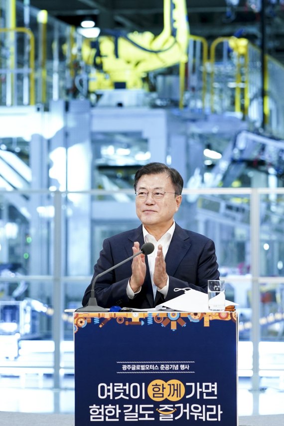 문 대통령은 축사에서 "광주 시민과 지자체, 노사가 사회적 대타협으로 탄생시킨 광주의 미래이자 대한민국의 미래"라며 "광주글로벌모터스 성장과 함께 잘사는 사회를 향한 광주의 꿈도 더욱 크게 자라날 것"이라고 축하했다.
