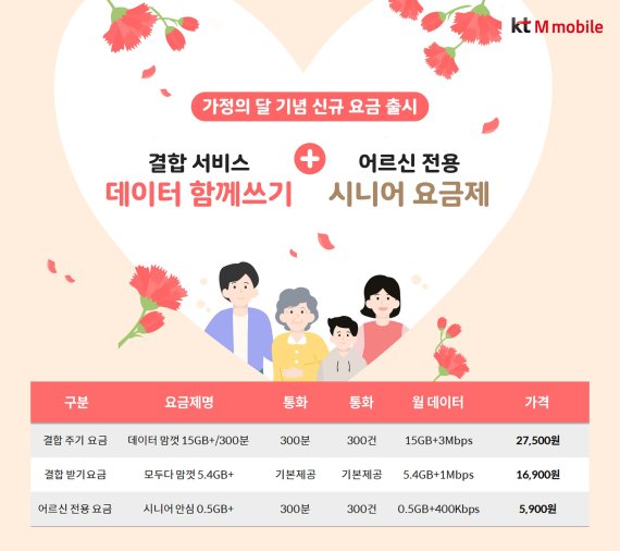 (서울=뉴스1) 김정현 기자 = KT의 알뜰폰 자회사 KT엠모바일이 5월 가정의 달을 맞아 가계 통신비 부담 완화를 위해 어르신 전용 요금제 1종을 출시하고, 알뜰폰 결합 서비스 '데이터 함께 쓰기' 적용 요금제를 확대한다고 30일 밝혔다.