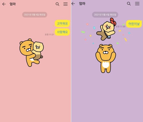 (서울=뉴스1) 송화연 기자 = 카카오톡이 5월 가정의 달을 맞아 카톡 채팅방에서 '감사해요' '사랑해요' '어버이날' 등 가정의달 관련 키워드를 입력하면 일시적으로 배경이 변하는 시즈널리티 효과 기능을 도입했다.
