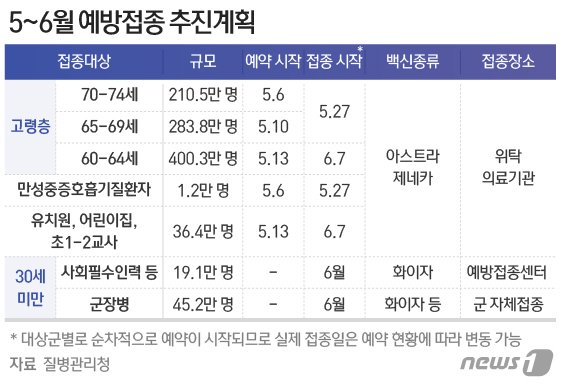 만 60~64세(1957년 1월1일 이후~1961년 12월31일 이전 출생) 400만3000명은 5월 13일부터 6월 3일까지 사전예약을 시작한다. 접종 기간은 6월 7일부터 19일까지다.