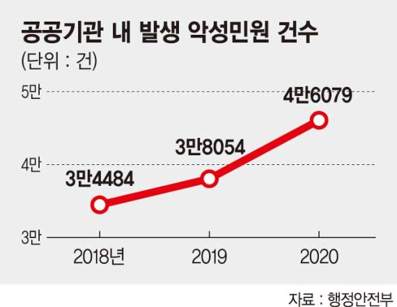 지난해 공공기관에서 발생한 악성민원 건수는 4만6000건을 넘어섰다. 정부가 악성민원 건수를 집계한 이래 최고 수치다.
