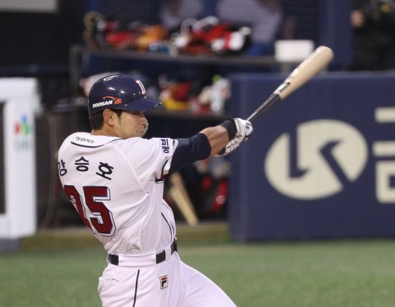 강승호는 6일 잠실 LG 트윈스전에 8번 타자 2루수로 선발 출전해 0-5로 뒤진 3회말 상대 선발 앤드류 수아레즈를 상대로 초구 147㎞ 투심패스트볼을 공략해 좌중간 담장을 넘어가는 솔로 홈런으로 연결했다.