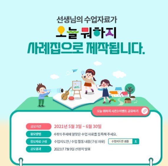 ‘오늘 뭐하지’ 시즌3는 ‘우리 동네를 탐험하는 날’, ‘미래의 내가 궁금한 날’, ‘다양한 문화를 가진 친구들과 함께’, ‘책으로 여는 수업’을 주제로 6월 30일까지 공모가 진행된다.
