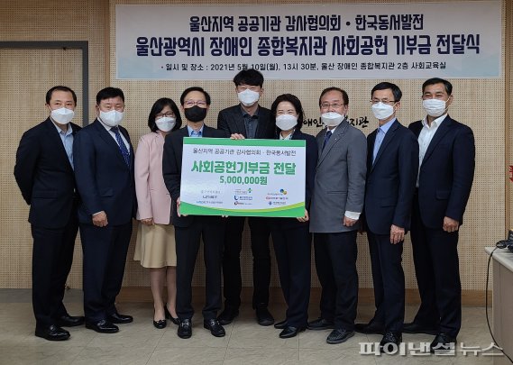 【파이낸셜뉴스 울산=최수상 기자】 '울산지역 공공기관 감사협의회'(이하 울감회)와 한국동서발전은 10일 울산시 장애인종합복지관에서 사회공헌기부금 전달식을 가졌다. 전달식에는 울감회 김혜경 회장(울산과학기술원 상임감사)과 한국동서발전 성식경 상임감사위원(한국 공공기관 감사협회 회장) 등 울산지역 9개 공공기관 감사(위원)이 참석했다.
