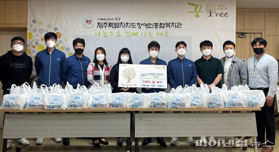 [제주=좌승훈 기자] 제주도개발공사 생산3팀 삼다수봉사대 소속 고병수 팀장과 현장교대 근무자들은 지난 7일 제주도장애인종합복지관의 재가 장애인과 복지관 이용자를 위해 ‘사랑 나눔 치킨’ 전달식을 가졌다. 이날 후원 물품은 재가 장애인과 복지관 이용 장애인 가정 40곳에 전달됐다. 공사 생산3팀 삼다수봉사대는 지난 4월 희망의 쿠키 전달을 시작으로 매월 1회 복지관 이용 장애인들에게 물품을 정기적으로 후원하고 있다.
