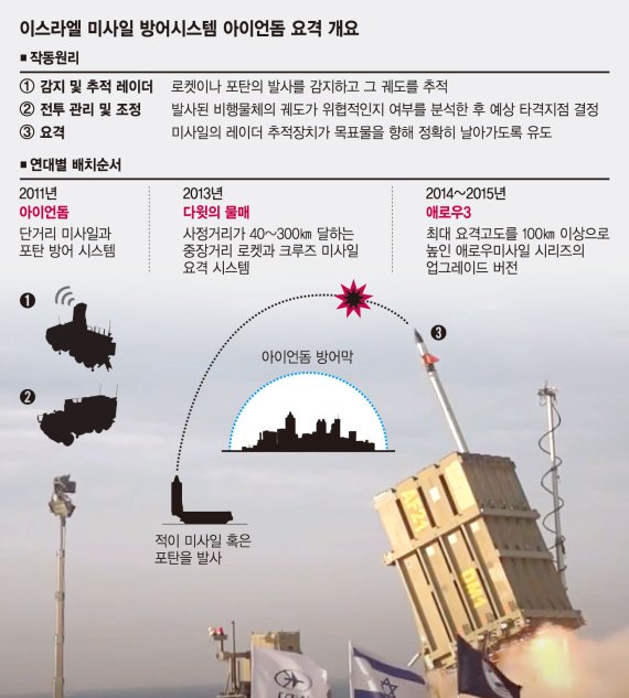 아이언돔은 여러 장소에 이동식 '타미르' 미사일 발사대를 이용해 날아오는 발사체를 공중에서 요격하는 체계다. 아이언돔 1개조는 미사일 20발을 발사하는 발사차량 3대와 레이더, 추적시스템, 사격통제장치 등으로 구성되며 요격 범위는 4~70km다.