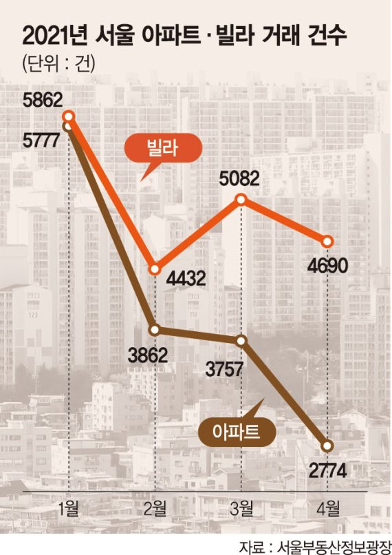 16일 서울부동산정보광장과 부동산 시장에 따르면 빌라와 아파트 거래 건수 격차는 점점 더 벌어지고 있다. 올해 서울 아파트 거래 건수는 1월 5777건, 2월 3862건, 3월 3757건, 4월 2774건이다. 같은 기간 빌라 거래 건수는 5862건, 4432건, 5082건, 4690건이다. 1월 85건 차이에 그쳤던 빌라와 아파트 거래 건수는 2월 570건, 3월 1325건, 4월 1916건으로 격차가 확대된 것이다.