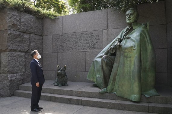 여기에 프랭클린 루스벨트 대통령 역시 문 대통령과 바이든 대통령의 인연을 잇는 연결고리다. 문 대통령은 20일(현지시간) 워싱턴D.C.에 위치한 프랭클린 델러노 루스벨트 기념관을 시찰했다.