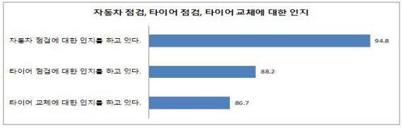 설문조사에 참여한 600명의 소비자 중 자동차 점검에 대해 인지하고 있는 응답자가 94.8%로 매우 높았다. 반면, 타이어 점검에 대한 인지는 88.2%, 타이어 교체에 대한 인지는 86.7%로 점검과 교체에 대한 시차가 있는 것으로 나타났다.