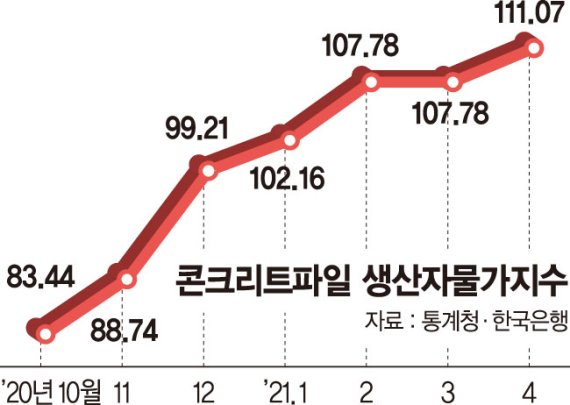 철근과 시멘트 가격 상승도 심화되고 있다. 철근 거래가격의 기준이 되는 SD400 제품을 기준으로 작년말 t당 60만원대 후반에서 현재 97만원까지 치솟았다. 5개월 만에 40%가량 값이 뛰었다. 통계청에 따르면 횡보를 이어오던 포틀랜드 시멘트도 107을 기록, 전월(103.45) 대비 3.55% 상승했다.