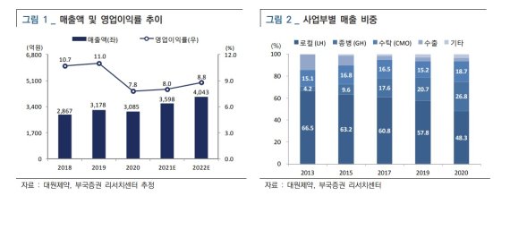 신 연구원은 "지난 2019년까지 연평균 성장률 16.7%로 고성장하며 매출액 272억원, 영업이익 15억원을 냈다"며 "향후 건강기능식품 시장 전망이 긍정적이고 대원제약 제품과 영업망을 활용한 시너지 효과를 기대한다"고 말했다.