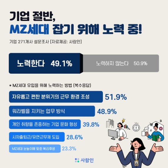 구인구직 매칭 플랫폼 사람인은 기업 271개사를 대상으로 ‘MZ세대 인재 유입과 장기 근속을 위한 노력 여부’에 대해 조사한 결과, 49.1%가 ‘별도로 노력하는 것이 있다’고 응답했다고 24일 밝혔다.