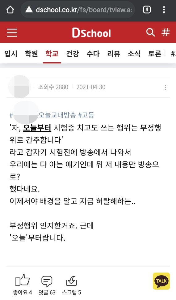 강남 3구(강남·서초·송파) 학부모들의 온라인 커뮤니티 '디스쿨'에는 지난달 29일 치러진 고1 중간고사에서 학생 1명이 '통합과학' 시험에서 시험 종료를 알리는 타종 이후 30초 동안 답안을 작성했다는 글이 게시됐다.