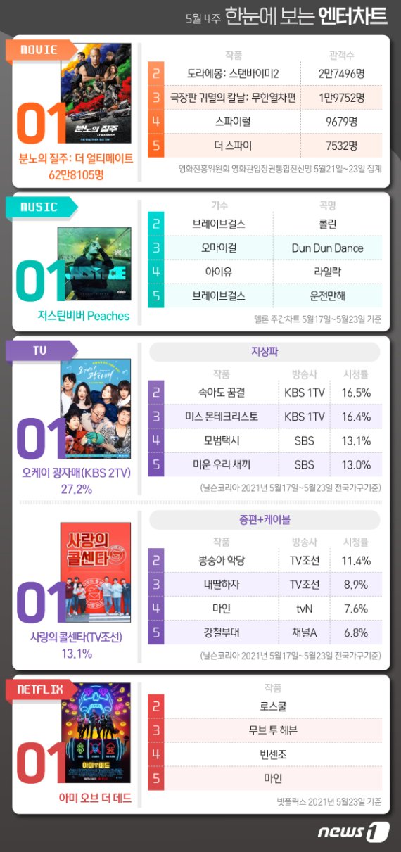 5월 넷째주 주말 박스오피스 1위는 영화 '분노의 질주: 더 얼티메이트'가 차지했다. '분노의 질주' 아홉 번째 시리즈인 이 영화는 지난 19일에 개봉해 첫 주말 62만8105명의 관객을 동원했다. 누적관객수는 113만2900명으로, 국내 개봉 첫날 시리즈 및 코로나19 시대 최고 오프닝 기록을 세웠다. 이어 애니메이션 영화 '도라에몽: 스탠바이미2'가 2만7496명으로 2위를, 지난 1월27일 개봉해 장기 흥행 중인 '극장판 귀멸의 칼날: 무한열차편'이 1만9752명으로 3위를 각각 기록했다. '쏘우' 스핀오프 영화인 '스파이럴'은 9679명을 동원해 박스오피스 4위에 랭크됐다.