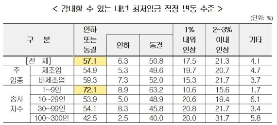조사 보고서에 따르면 중소기업의 57.1%는 내년 최저임금을 동결(50.8%)하거나 인하(6.3%)해야 한다고 응답했다. 특히 10인 미만 기업에서 최소한 동결해야 한다는 응답은 72.1%에 달했다.