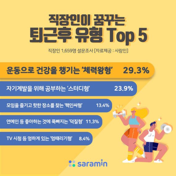 27일 구인구직 매칭 플랫폼 사람인이 직장인 1659명을 대상으로 ‘직장인이 꿈꾸는 퇴근 후 유형’을 조사한 결과에 따르면 운동으로 건강을 챙기는 ‘체력왕형’(29.3%)이 1위를 차지했다.