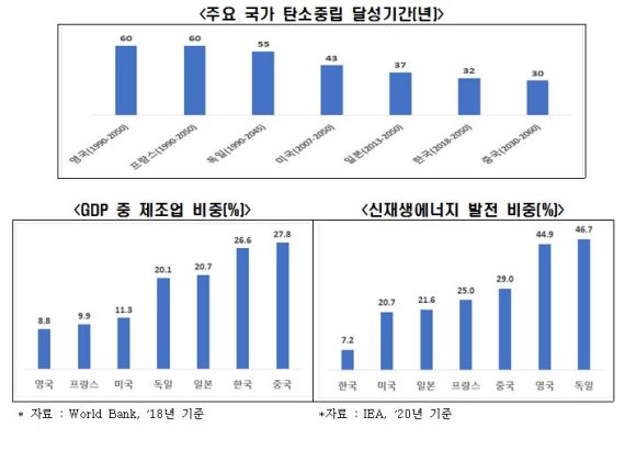 반면 한국은 2018년을 기준으로 2050년까지 32년간 탄소중립을 달성할 계획이라 달성기간이 선진국에 비해 짧은 편이다.
