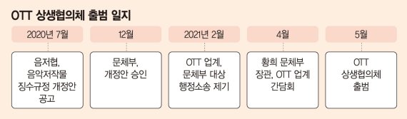 갈등이 번지자 황 장관이 OTT 업계 간담회를 열고 상생협의체 구성을 약속한 것이다. 이후 OTT 상생협의체 구성을 놓고도 어려움을 겪었다. 음저협 등 음악권리자는 문체부 장관이 승인한 음악저작권료 징수규정을 상생협의체에서 재논의할 수 없다는 강경한 입장을 고수했기 때문에 상생협의체 진행 자체가 표류하는 상황이었다.